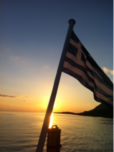 Mit dem Schiff zurück, im Sonnenuntergang, und nach einer sehr kurvigen Fahrt haben wir noch alle zusammen Tausende leckere Vorspeisen und Salat in einer Taverne im Nachbarort gegessen.